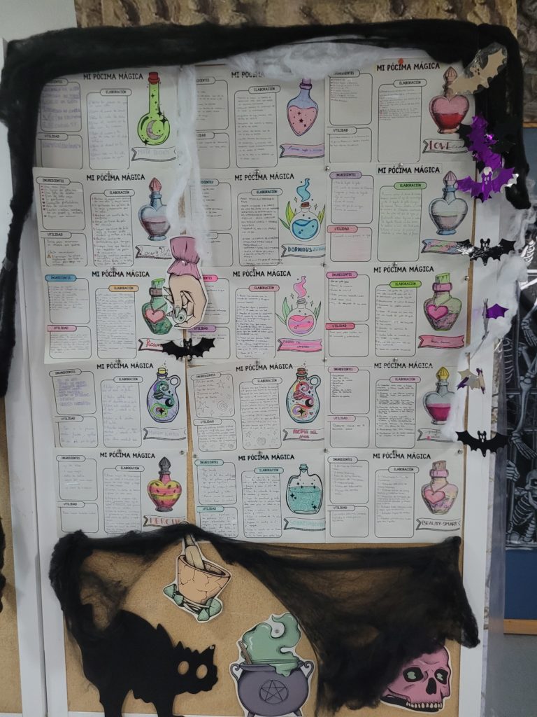 Se decora la biblioteca, este año se han expuesto calabazas hechas por los alumnos, se han escrito pócimas mágicas, epitafios graciosos, relatos y microrrelatos; los grupos de 1º y 2º de ESO han visionado cortos, han leído otros relatos de terror…