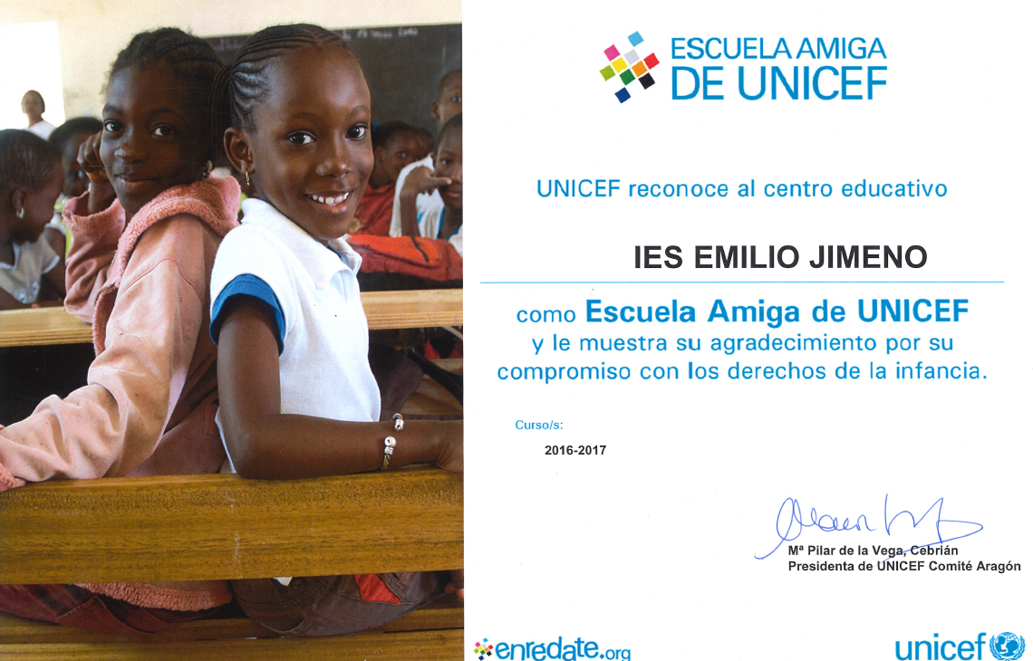 El IES Emilio Jimeno recibió el curso 2016-17 el certificado que acredita que es «ESCUELA UNICEF AMIGA DE LA INFANCIA». Este reconocimiento avala la implicación de nuestro centro en la Convención de las Naciones Unidas sobre los Derechos del Niño de 1989. Si haces clic en la siguiente imagen podrás conocer una versión reducida de los Derechos del Niño.