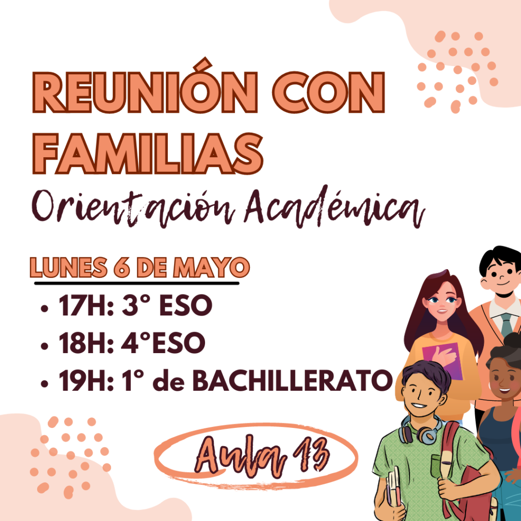 Buenas tardes. Escribimos para convocaros el próximo lunes día 6 de mayo a las 17h en el aula 13 donde tendrá lugar la reunión con las familias del alumnado que se encuentra cursando 3ºESO para explicaros las posibilidades académicas de cara al curso 24-25: materias optativas de 4º y/o FPb.