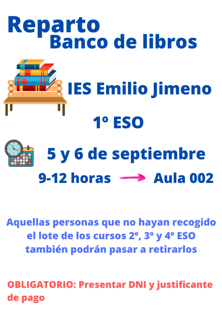 Las familias beneficiarias del banco de libros podrán pasar a recoger el lote de libros de 1º ESO los días 5 y 6 de septiembre en horario de 9 a 12 horas. Aquellas familias que no hubieran recogido el lote de 2º, 3º y 4º ESO realizado en julio también lo podrán retirar en estas fechas.