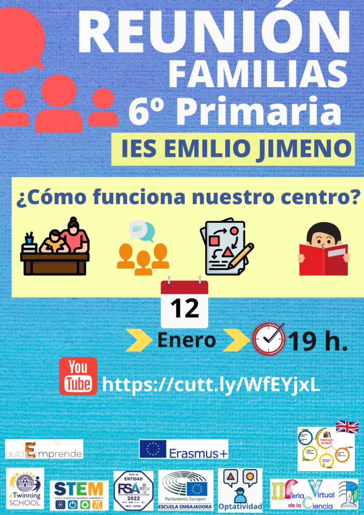 Debido a la situación de COVID no es posible realizar las reuniones para familias de alumnado de 6º de Primaria. Por este motivo, realizaremos una sesión informativa online el próximo miércoles 12 a las 19:00 h. a través de nuestro canal de Youtube. (https://cutt.ly/WfEYjxL)
